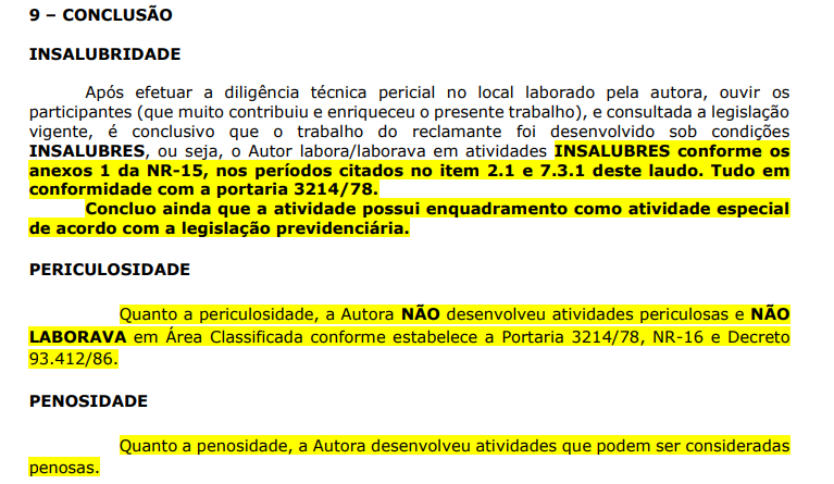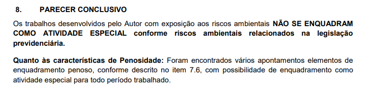 Para comprovação da especialidade, foi produzida prova pericial, cujo laudo atestou as seguintes condições:
