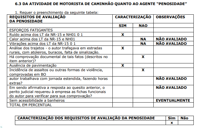 1. Análise do(s) veículo(s) efetivamente conduzido(s) pelo trabalhador. O perito deverá diligenciar junto à(s) empresa(s) empregadora(s) para descobrir a marca, o modelo e o ano de fabricação do(s) veículo(s) conduzido(s) e, de posse dessas informações, poderá analisar se existia ou não penosidade na atividade em razão da necessidade de realização de esforço fatigante, como, por exemplo, na condução do volante, na realização da troca das marchas, ou em outro procedimento objetivamente verificável. No caso dos motoristas de ônibus deverá ser averiguado se a posição do motor ficava junto à direção, ocasionando desconfortos ao trabalhador, como, por exemplo, vibrações, ruído e calor constantes (ainda que inferiores aos patamares exigidos para reconhecimento da insalubridade da atividade, mas elevados o suficiente para qualificar a atividade como penosa em virtude da constância da exposição), ou outro fator objetivamente verificável.