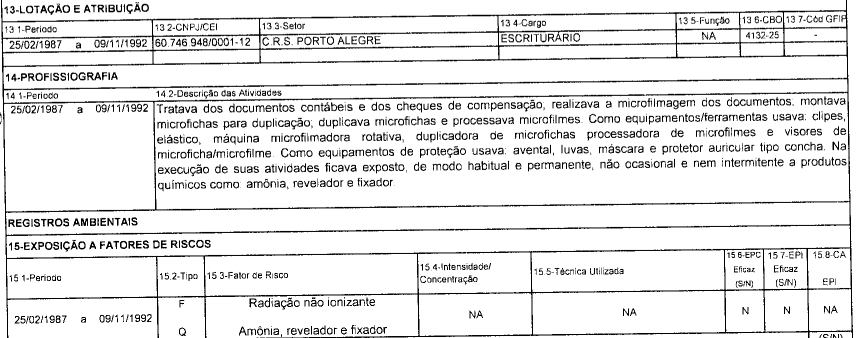 25/02/1987 a 09/11/1992 | agentes químicos (amônia, revelador e fixador) | - | - | - | não | não |