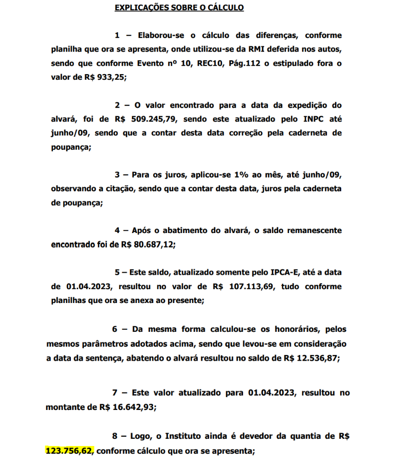 Sustentou a agravante que seu cálculo está correto, porque não houve pagamento das diferenças verificadas quanto à renda mensal inicial no período posterior ao último precatórios, portanto de dezembro de 2000 a março de 2020.