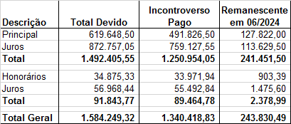 Na sequência, para fins de abatimento, atualizamos os valores incontroversos requisitados nas fls. 299-303 do evento 9 - OUT3, na quantia de R$ 348.865,51 (R$ 325.242,84 autor e R$ 23.622,67 honorários) e data-base 10/2009. Calculamos a quantia atualizada de R$ 1.340.418,83 sendo, R$ 1.250.954,05 ao autor e R$ 89.464,78 de honorários advocatícios, atualizados até 06/2024.