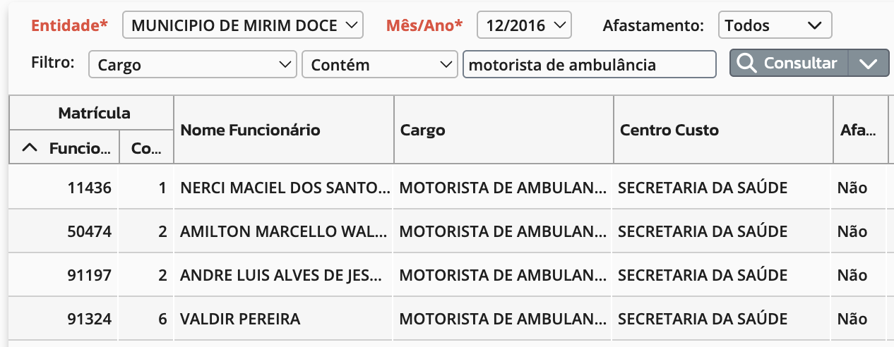Não é demais dizer que o PPRA retrata que o Município contava com 10 servidores na função de motorista junto à Secretaria de Educação e 4 servidores na função de motorista de ambulância junto à Secretaria de Saúde. Conforme a transparência pública do ente municipal (<Portal da Transparência - MUNICIPIO DE MIRIM DOCE> Acesso em 25 out. 2024), em dezembro/2016, quatro servidores ocupava o cargo de motorista de ambulância, dentre os quais não se lista o autor: