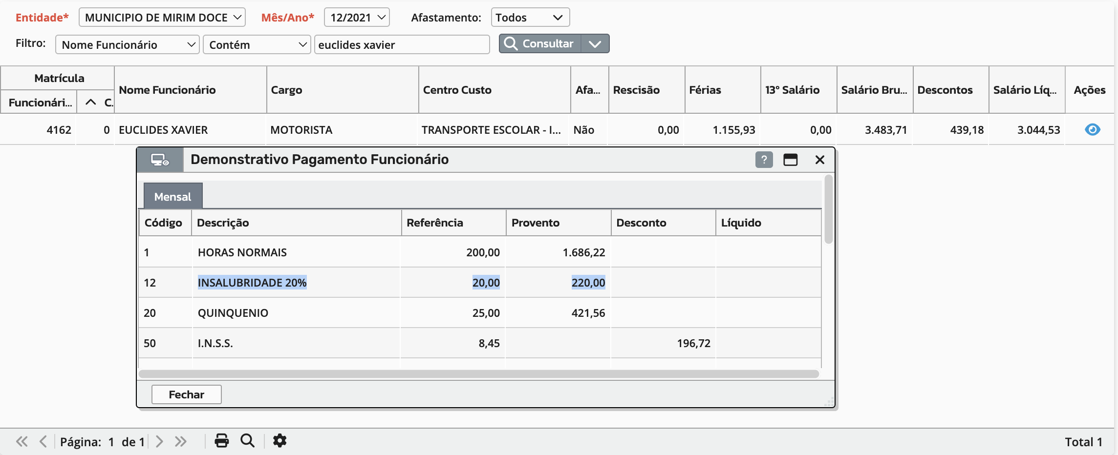 Ressalto, oportunamente, que não consta dos autos o laudo ambiental mencionado no ev. , que teria reconhecido o direito do servidor ao adicional de insalubridade; e que a CTC do ev. , p. 158-160 indica que o autor estava lotado no setor de "transporte escolar - infantil" em dezembro/2021. E, conforme a transparência pública do ente municipal (<Portal da Transparência - MUNICIPIO DE MIRIM DOCE> Acesso em 25 out. 2024), o autor continuou recebendo o adicional de insalubridade: