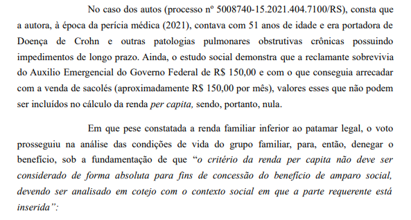 Registre-se que, a prevalecer o posicionamento da Turma Recursal que insistiu em deixar de observar a tese firmda neste Colegiado quando oportunizada a retratação, retornaria-se ao status quo anterior à fixação da tese do IRDR 12/TRF4, no qual, ainda que a renda mensal per capita familiar se revelasse abaixo do patamar previsto em lei, pedidos de BPC eram negados judicialmente sob análise e fundamentação subjetivista das condições de habitação ou de vida.