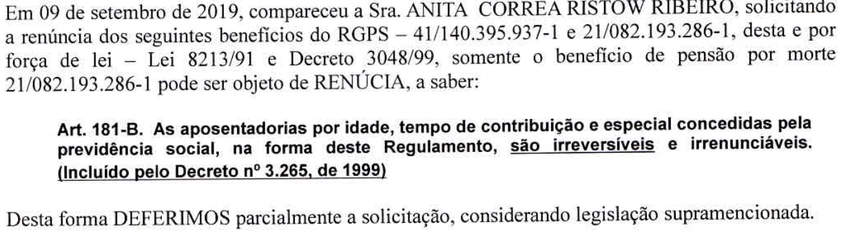 Ressalte-se, ainda, que o INSS já procedeu à cessação de outro benefício de pensão por morte que a impetrante recebia (NB 082.193.286-1), em atendimento ao requerimento formulado em 09.09.2019 (evento 1, OUT8). Na ocasião a impetrante também renunciou ao recebimento do benefício de aposentadoria por idade, porém o requerimento foi indeferido pela autarquia, sob a justificativa de que as aposentadorias por idade são irreversíveis e irrenunciáveis.