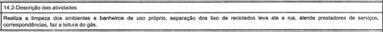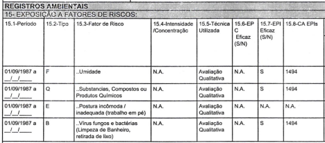 Produtos químicos: Exposição habitual e intermitente (cinco horas) a produtos de limpeza como álcool, água sanitária e detergente, com riscos triviais. Atividade considerada salubre.