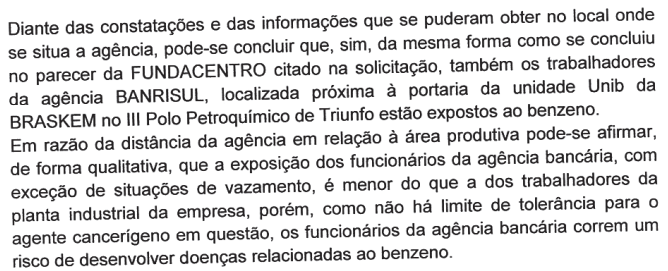 Observação 1: A parte autora, de 26/10/1977 a 01/04/2001, prestou serviços nas dependências do Polo Petroquímico de Triunfo/RS, no qual são produzidas, entre outras substâncias químicas, o benzeno. Embora o laudo da empresa não faça referência, no parecer elaborado pela FUNDACENTRO para instruir o Inquérito Civil Público n° 1.29.000.000814/2007-55, instaurado no MPF/RS, é afirmado que não há nível de exposição segura ao benzeno, por ser muito tóxico e comprovadamente cancerígeno, conforme o item 6.1 do Anexo 13-A da NR-15, in verbis: "6.1 O princípio da melhoria contínua parte do reconhecimento de que o benzeno é uma substância comprovadamente carcinogênica, para a qual não existe limite seguro de exposição. Todos os esforços devem ser dispendidos continuamente no sentido de buscar a tecnologia mais adequada para evitar a exposição do trabalhador ao benzeno". Para registro, o benzeno foi assim descrito no citado parecer: "substância química do tipo hidrocarboneto aromático, de odor característico, líquido, volátil, incolor, altamente inflamável, explosivo, não polar e lipossolúvel". O próprio INSS tem adotado essas conclusões nos processos administrativos mais recentes, promovendo o reconhecimento do tempo especial. Mesmo para atividades não diretamente relacionadas à fabricação ou utilização de benzeno, inclusive de natureza burocrática/administrativa, aplica-se esse entendimento, diante da possibilidade de contaminação, segundo afirmado na conclusão do parecer da FUNDACENTRO.